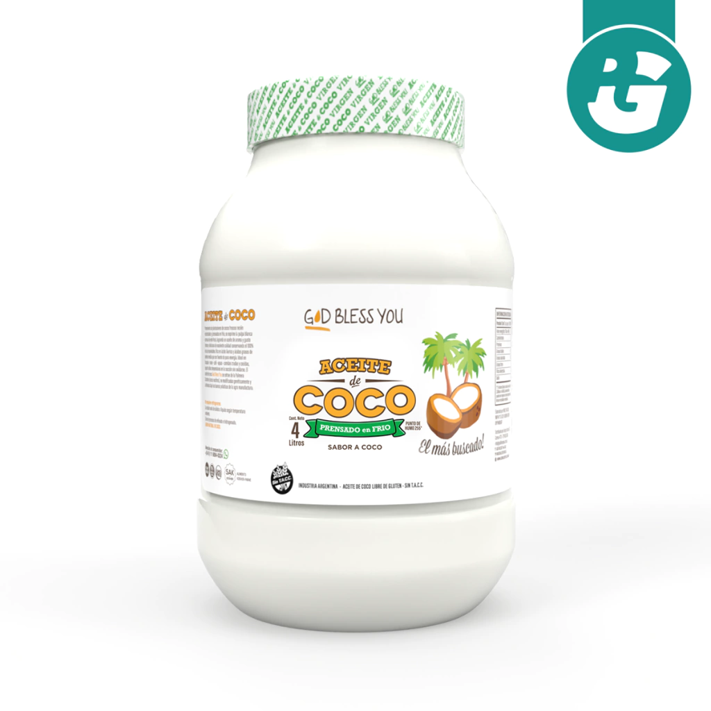 Aceite de coco Virgen God Bless You calidad premium. Proveniente de plantaciones Filipinas de cocos frescos recién recolectados y prensados en frío se explime la pulpa blanca carnosa de este fruto, logrando un aceite intenso y delicioso de excelente calidad, conservando el 100% de sus propiedades.